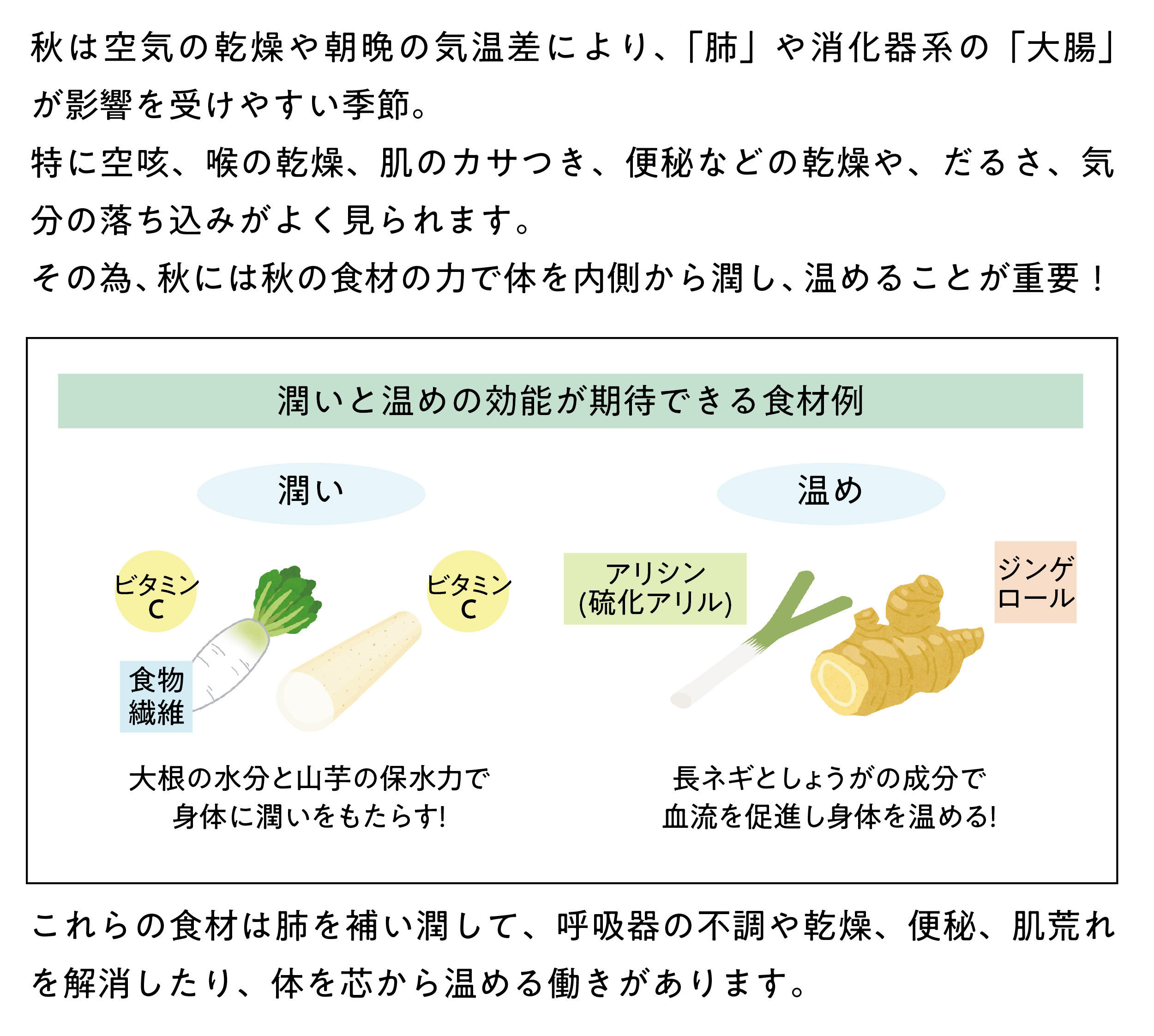 大根、長ネギ、生姜などはこれらの食材は肺を補い潤して、呼吸器の不調や乾燥、便秘、肌荒れを解消したり、体を芯から温める働きがあります。