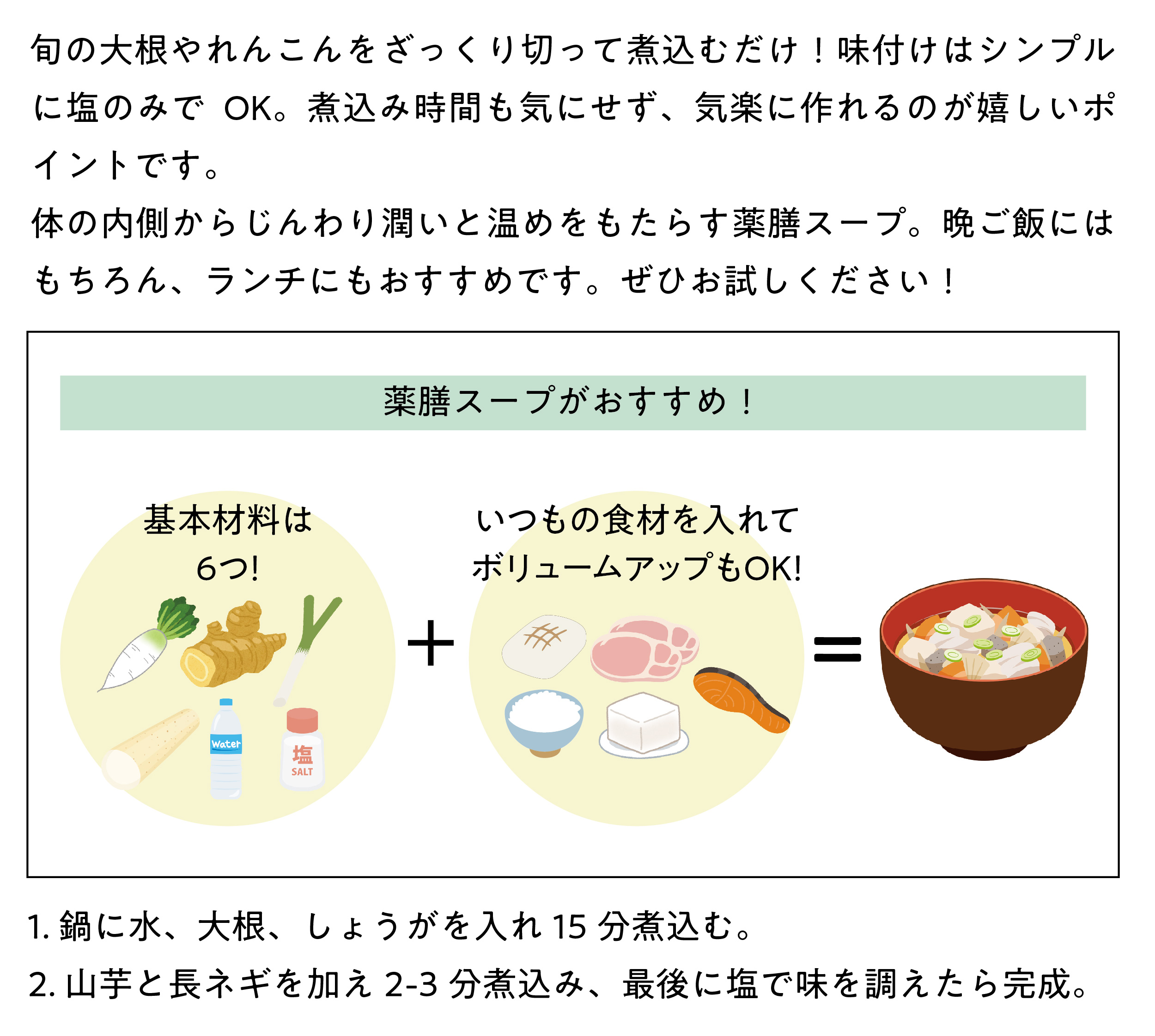 そんな時、内側から「潤い」「温め」をもたらす薬膳がおすすめです。