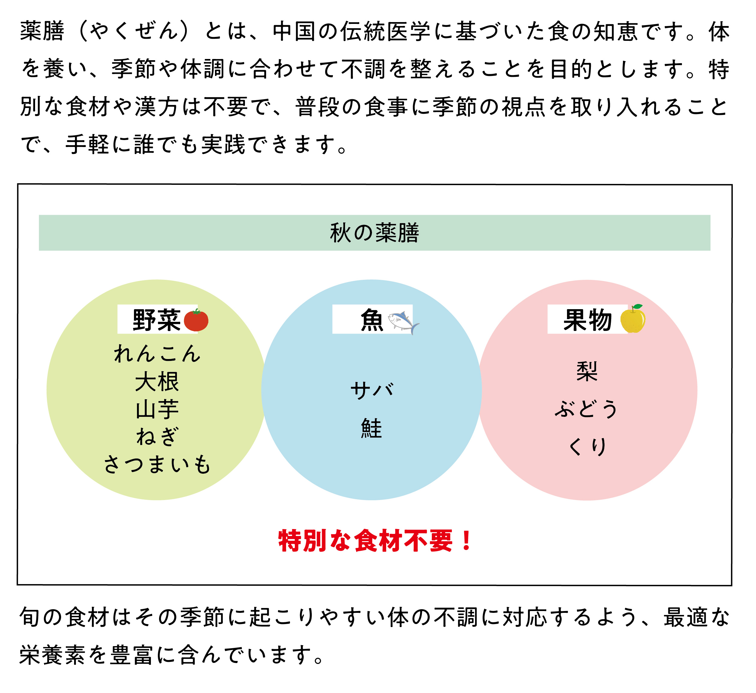 特別な食材や漢方は不要で、普段の食事に季節の視点を取り入れることで、手軽に誰でも実践できます。