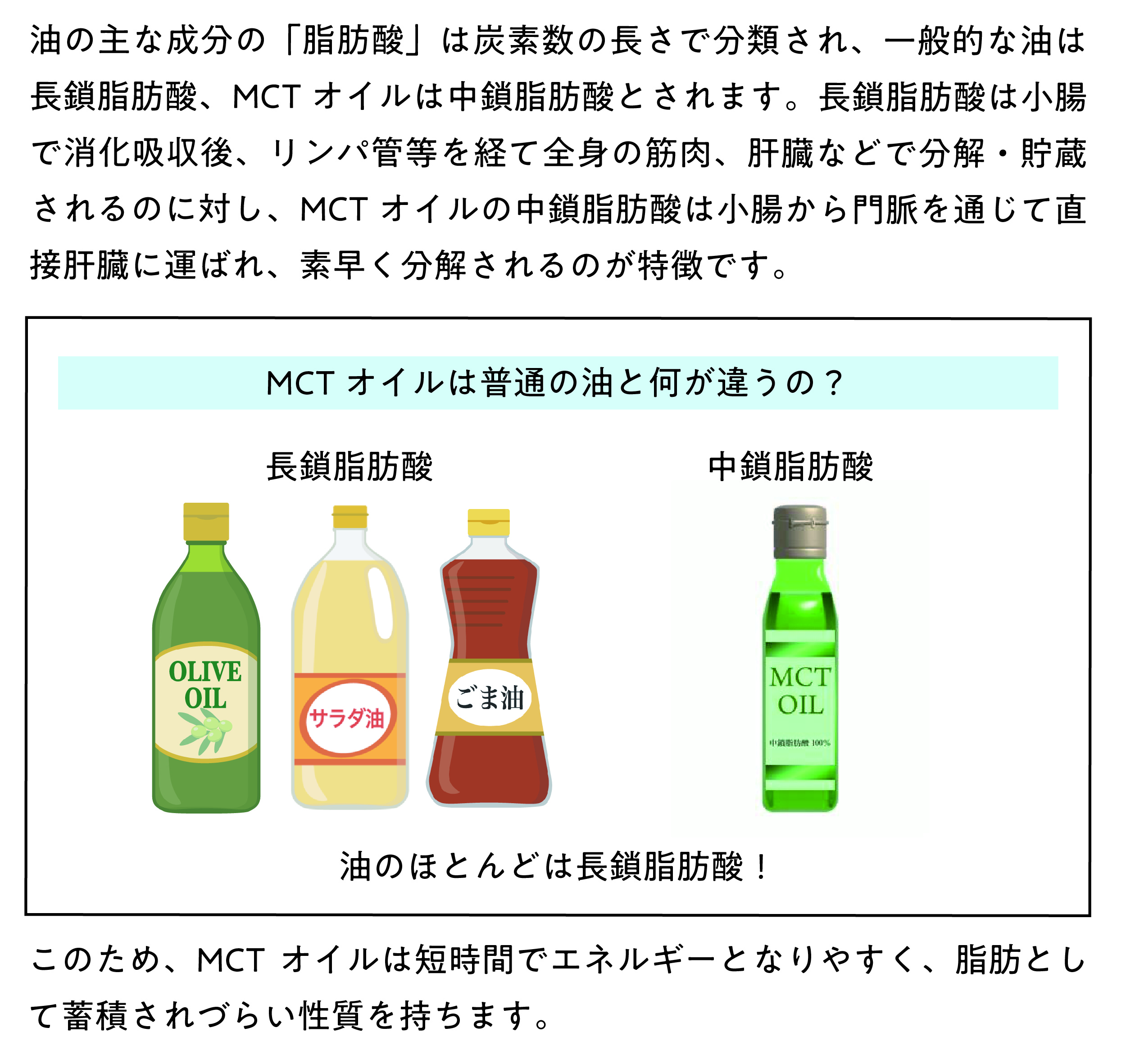 一般的な油は長鎖脂肪酸、MCTオイルは中鎖脂肪酸とされます。