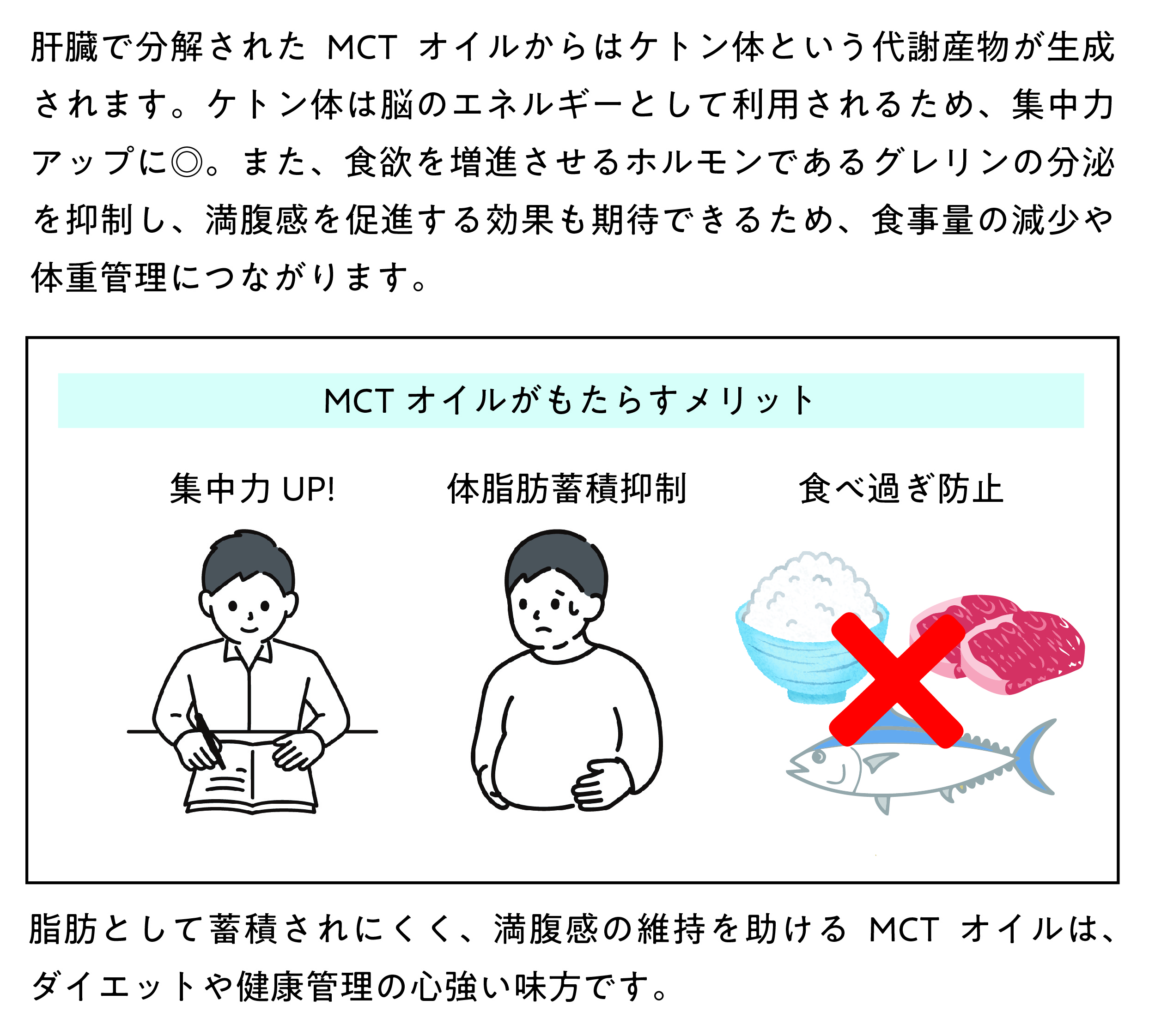 MCTオイルからはケトン体という代謝産物が生成されます。ケトン体は脳のエネルギーとして利用されるため、集中力アップに◎。