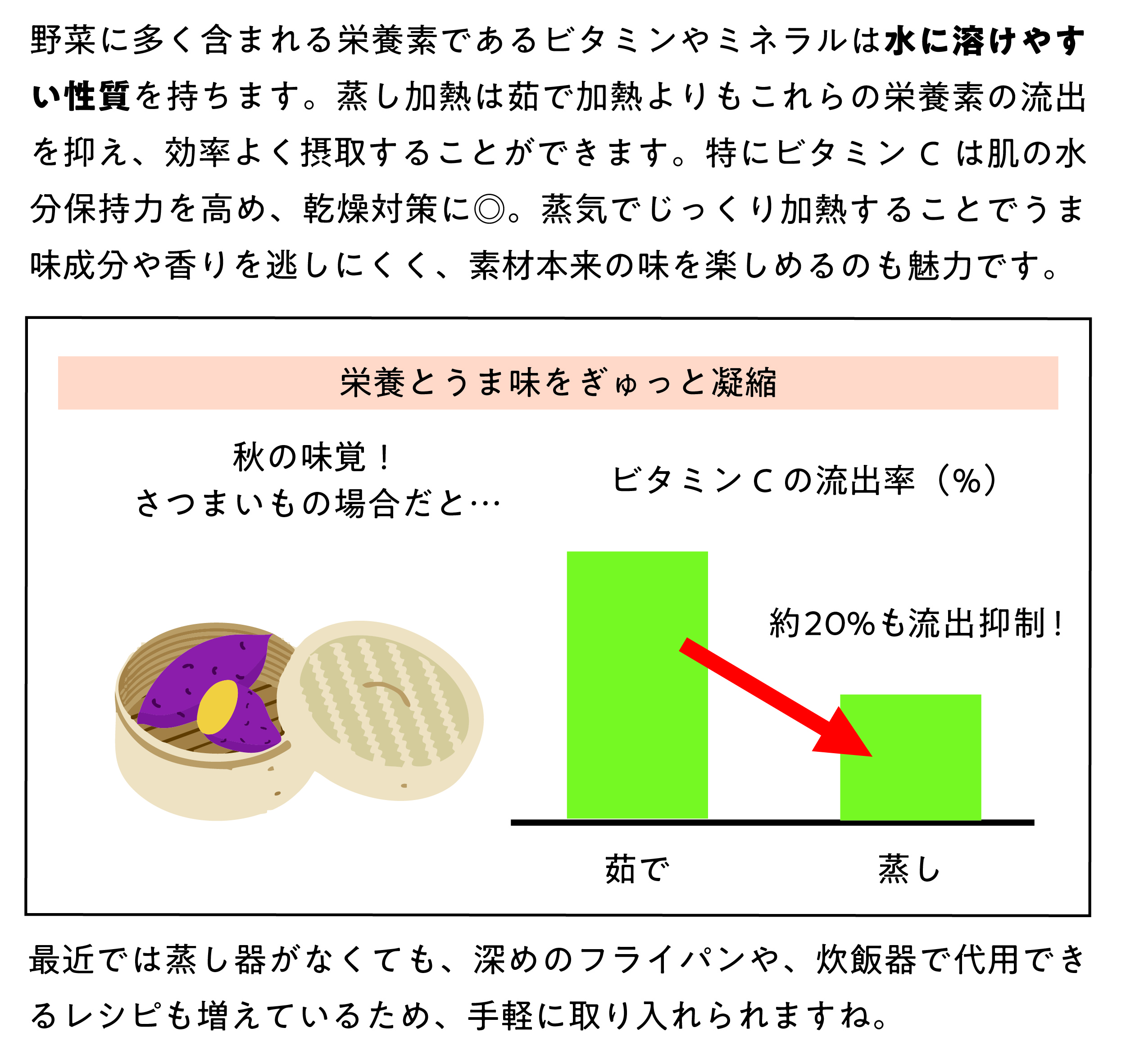 野菜に多く含まれる栄養素であるビタミンやミネラルは水に溶けやすい性質を持ちます。蒸し加熱は茹で加熱よりもこれらの栄養素の流出を抑え、効率よく摂取することができます。特にビタミンCは肌の水分保持力を高め、乾燥対策に◎。