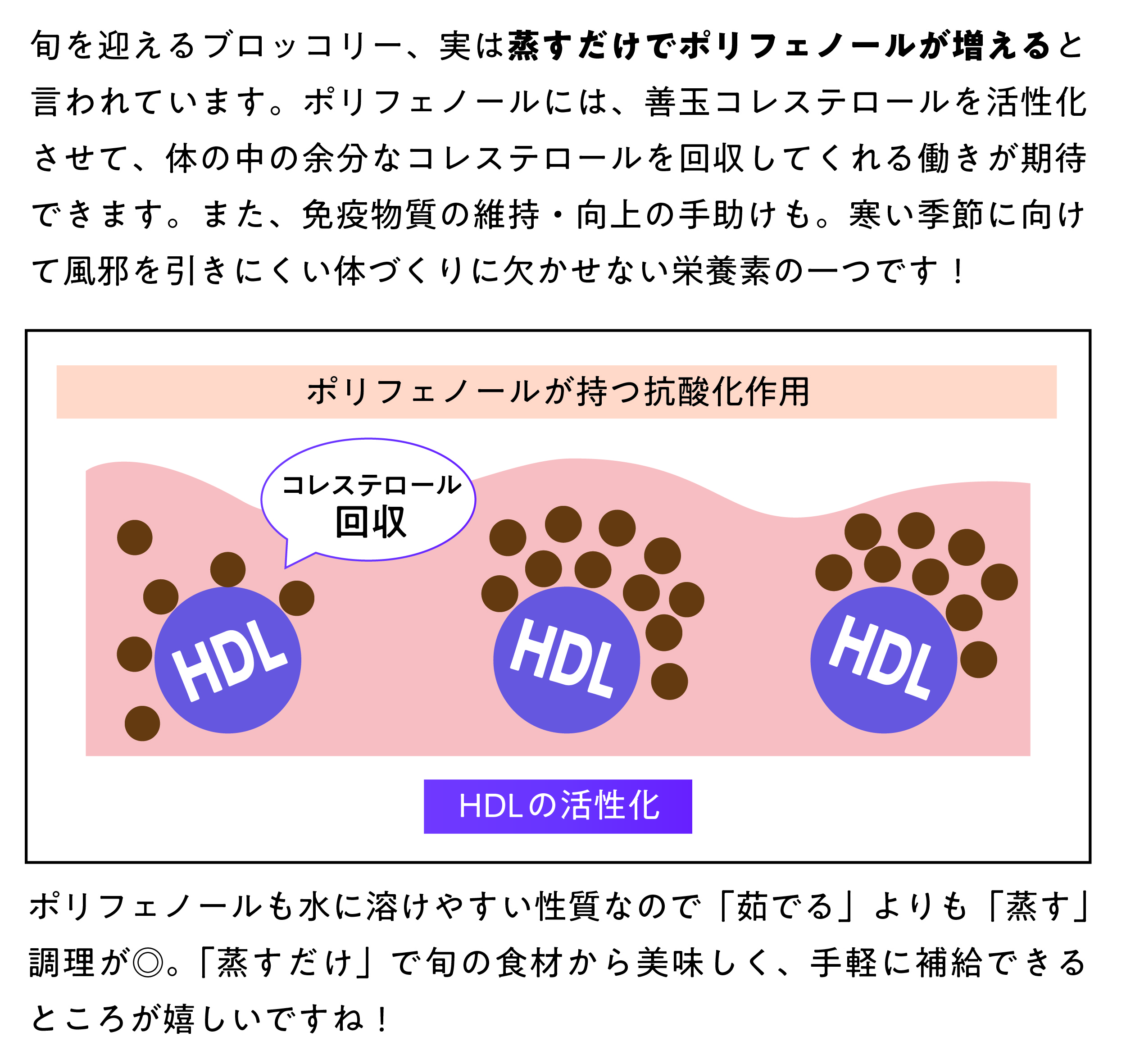 ブロッコリーは、蒸すだけでポリフェノールが増えると言われています。ポリフェノールには、善玉コレステロールを活性化させて、体の中の余分なコレステロールを回収してくれる働きが期待できます。また、免疫物質の維持・向上の手助けも。寒い季節に向けて風邪を引きにくい体づくりに欠かせない栄養素の一つです!