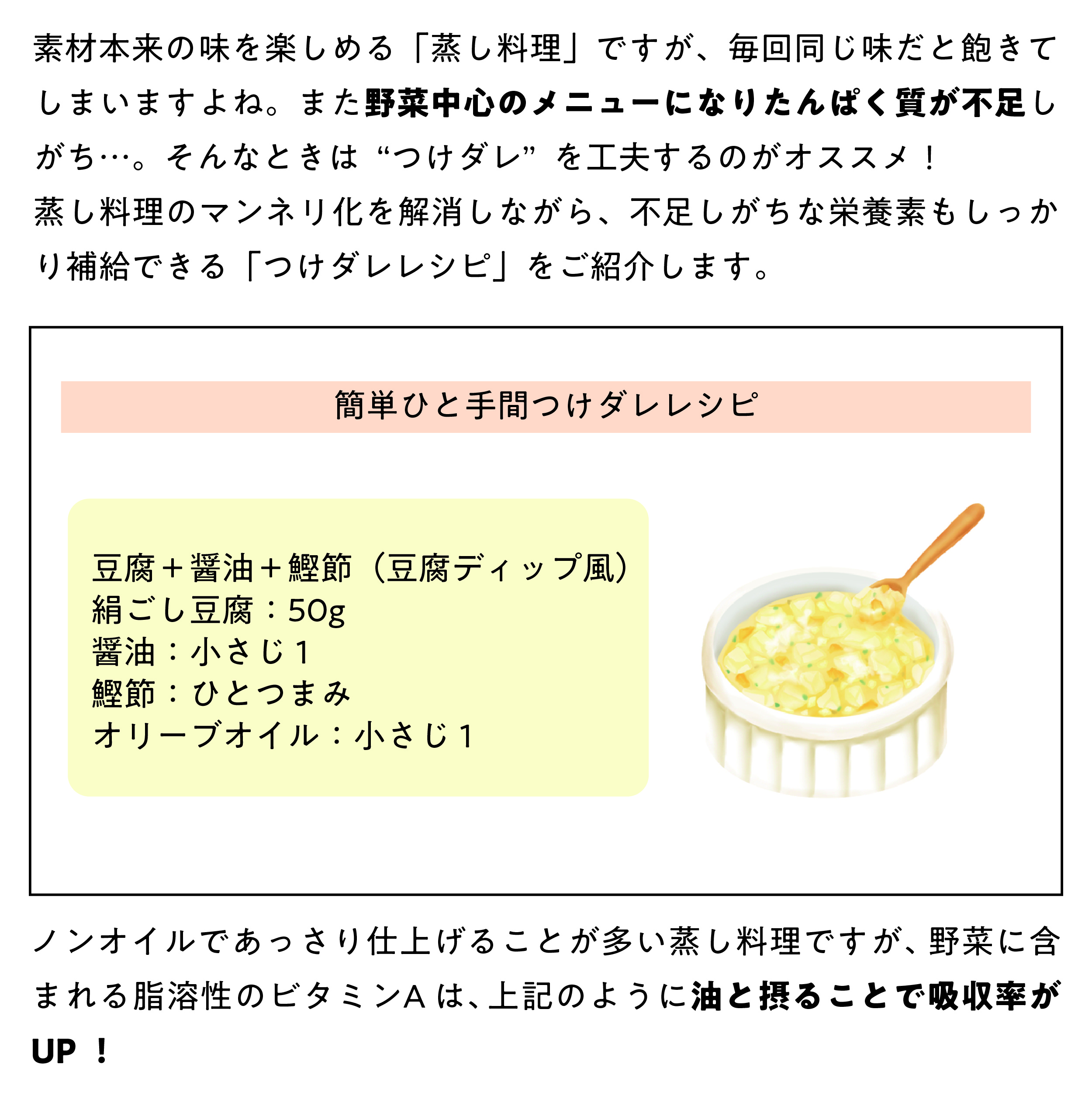 野菜中心のメニューになりたんぱく質が不足しがち…。そんなときは“つけダレ”を工夫するのがオススメ!